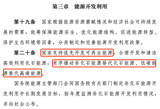 第二十條:國家支持優(yōu)先開發(fā)可再生能源,合理開發(fā)和清潔高效利用化石能源,有序推動非化石能源替代化石能源、低碳能源替代高碳能源。國務(wù)院能源主管部門會同國務(wù)院有關(guān)部門制定非化石能源開發(fā)利用中長期發(fā)展目標(biāo),按年度檢測非化石能源開發(fā)利用情況,并向社會公布。