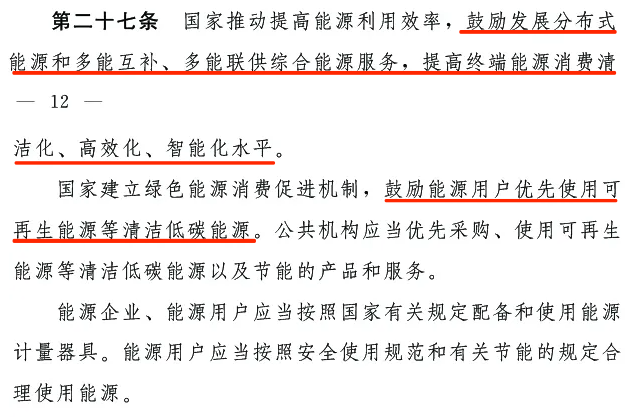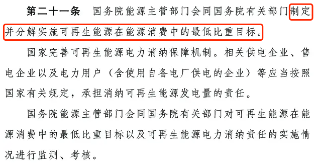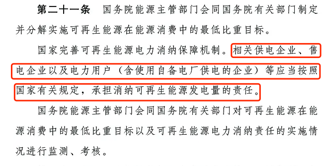 第二十一條:國家完善可再生能源電力消納保障機(jī)制。相關(guān)供電企業(yè)、售電企業(yè)以及電力用戶 (含使用自備電廠供電的企業(yè))等應(yīng)當(dāng)按照國家有關(guān)規(guī)定,承擔(dān)消納可再生能源發(fā)電量的責(zé)任。國務(wù)院能源主管部門會同國務(wù)院有關(guān)部門對可再生能源在能源消費(fèi)中的最低比重目標(biāo)以及可再生能源電力消納責(zé)任的實(shí)施情況進(jìn)行監(jiān)測、考核。